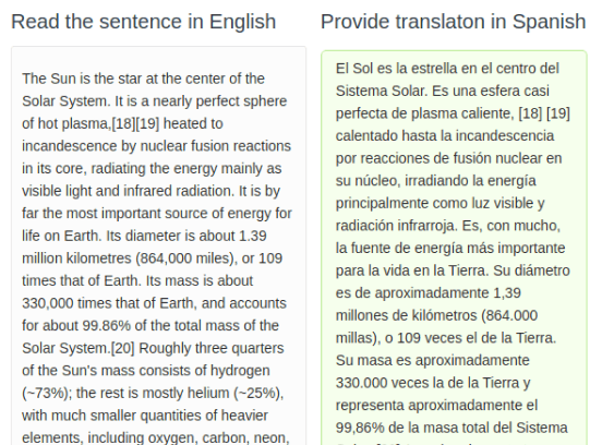Use the TextArea control tag to provide an editable, required text box to provide a translation of the text, and include a Submit button for annotators: