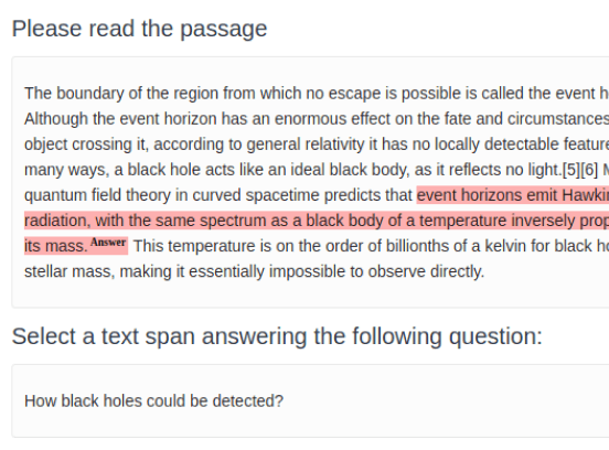 If you want to train a question answering machine learning model, use this template to develop a dataset. This template prompts annotators to read a passage of text, then highlight the span of text that answers a specific question.